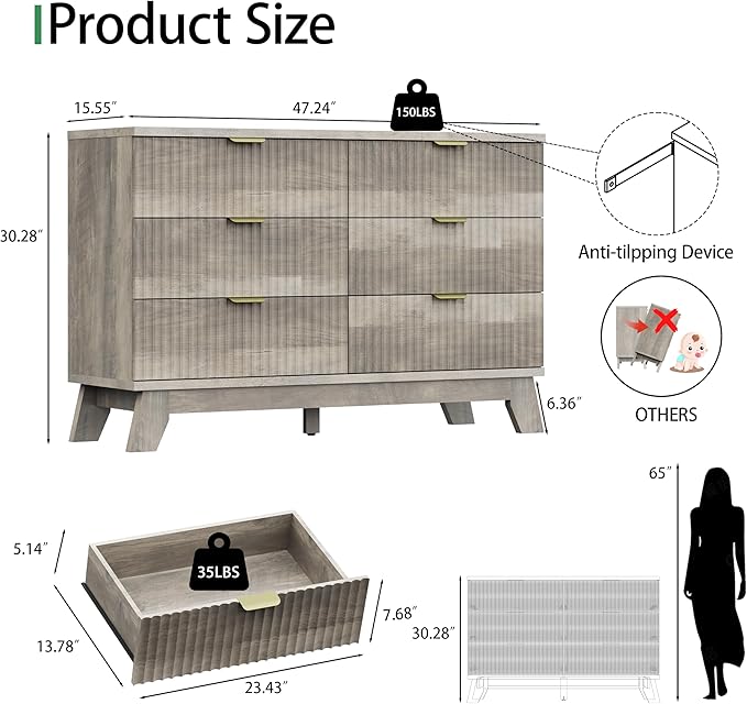 - 【Large Storage Capacity】The dresser for closet features 6 deep drawers that provide plenty of room for organizing clothing, bedding, cosmetics, or jewelry, helping you maintain a neat and tidy space. The wide wooden tabletop can serve as a dresser TV stand or display your decorations such as photo frames, plants or mirrors. Perfect for bedroom, living room, hallway, entryway