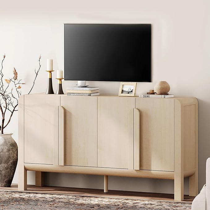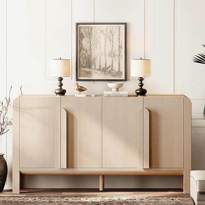 - French Vintage Style & Arched Design: Finished in light wood tones, this farmhouse sideboard brings a warm, With unique rounded handles and smooth curved edges, this modern sideboard adds a soft, refined aesthetic.Vintage vibe while maintaining clean modern lines. Ideal as a wooden cabinet for living rooms, kitchens, or entryways.