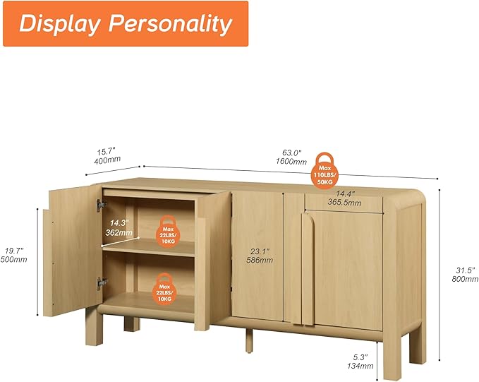 - Large Storage Buffet Cabinet with 4 Doors:This large buffet cabinet with storage features 4 doors and roomy compartments inside, ideal for organizing tableware, small appliances, or pantry items.Dimensions: 63" W x 15.7”D x 31.5”H – perfect as a dining room buffet cabinet, kitchen buffet storage cabinet, or buffet table with storage.
