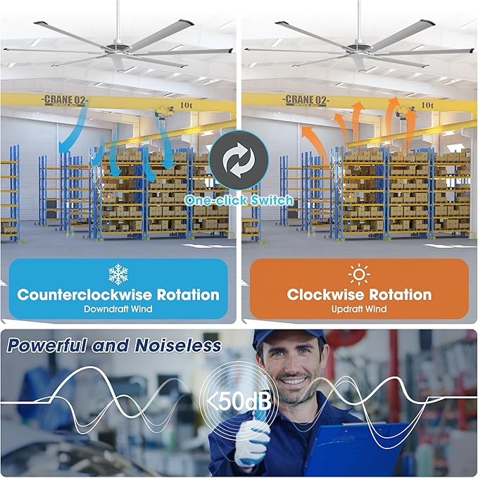 - 100-INCH CEILING FANS: This 100-inch industrial ceiling fan is equipped with the powerful DC motor without noise. Features a sleek modern design that blends seamlessly with any home decor. Perfect for living room, bedroom, covered pario, shop, restaurant, warehouse, etc.