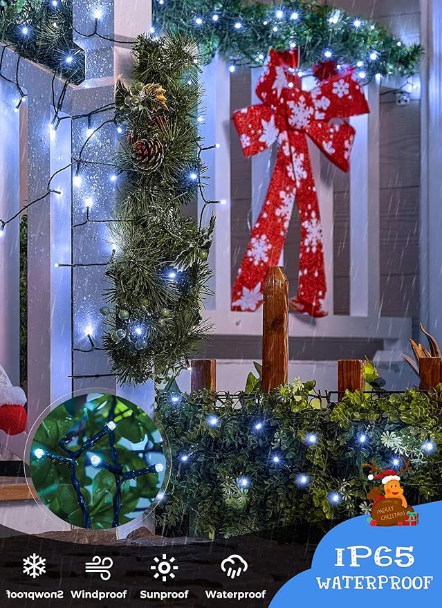 - 【Unique Solar Christmas Lights Outdoor】These solar string lights outdoor waterproof contains 4pcs of string lights, each string lights is 39ft long with 120LEDs and 7ft leading wire. The cool white lighting and the green wire matches the color of your Christmas party perfectly.