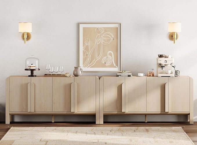 - French Vintage Style & Arched Design: Finished in light wood tones, this farmhouse sideboard brings a warm, With unique rounded handles and smooth curved edges, this modern sideboard adds a soft, refined aesthetic.Vintage vibe while maintaining clean modern lines. Ideal as a wooden cabinet for living rooms, kitchens, or entryways.