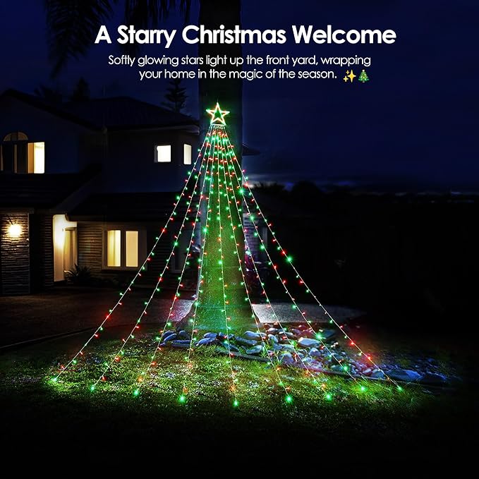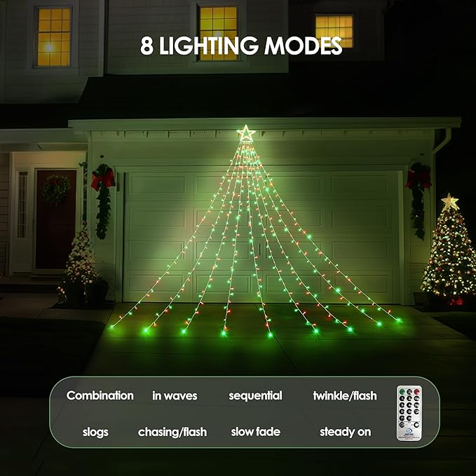 - Stunning Waterfall Light Effect: Featuring a 12-inch shining star on top and 9 gracefully draped light strands, these Christmas lights create a stunning waterfall effect, transforming your home into a festive wonderland. Perfect for decorating trees, walls, porches, and more!
