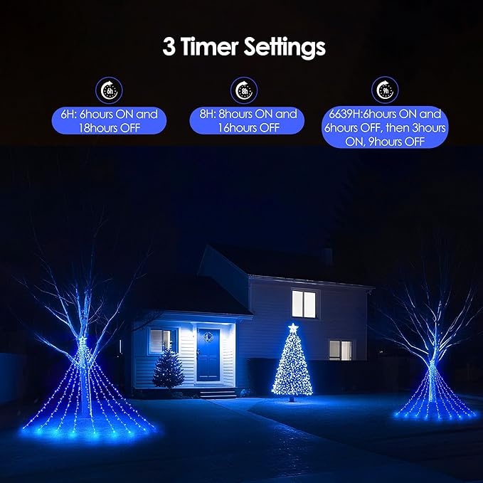 - 3 Timer Options for Outdoor Christmas Decorations: Customize your holiday lighting schedule with 3 flexible timer settings - 6H (6h on/18h off), 8H (8h on/16h off), and 6639H (6h on/6h off/3h on/9h off). Compared to others Christmas lights with only one fixed 6H timer, Ours provide 3x more scheduling choices for energy-saving displays, all-evening festivities, or automated holiday lighting.