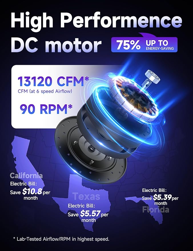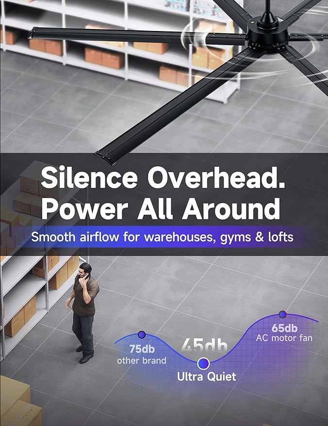 - Save 75% energy:The commercial hvls ceiling fans with DC motor delivers 13,120 CFM at top speed and a steady 6,543 CFM on low, with quiet, reliable performance.Perfect for patios、garage and commercial spaces