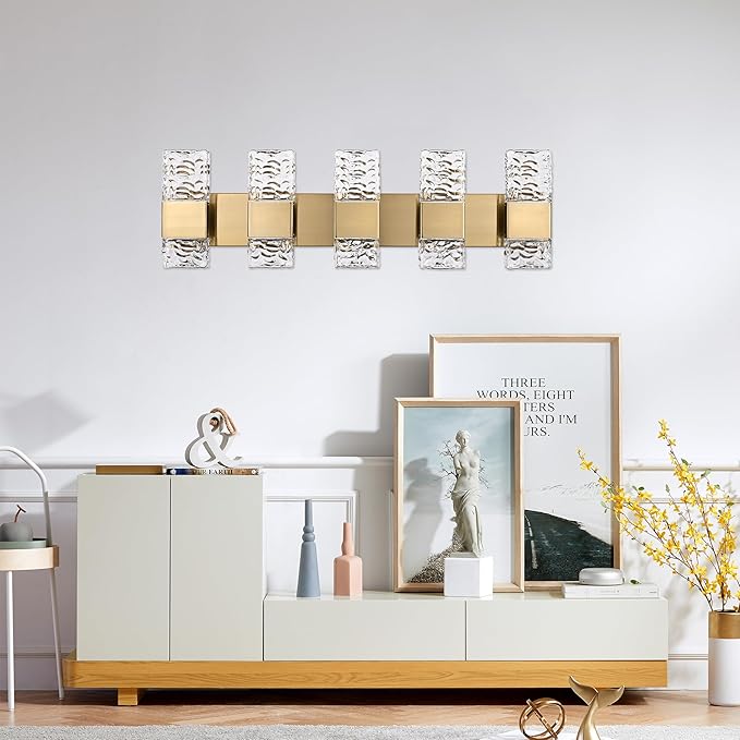 VINLUZ LED 40W Modern Bathroom Lighting Fixture 5 Light in Brushed Brass Finish,Farmhouse Vanity Lights with Crystal Lampshade,Metal Indoor Wall Lamp Over Mirror