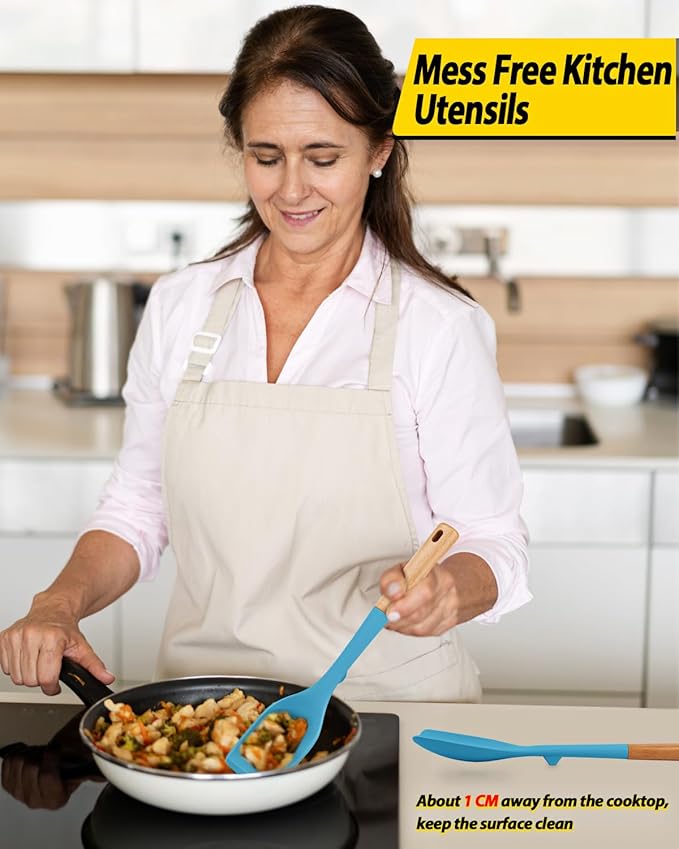 - Thoughtful Design: The little bulge design prevents the silicone head from touching the cooktop after cooking, effectively keeping the surface clean;Wooden handle keeps you away from the trouble of cooking utensils rusting or breaking