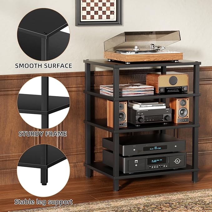 4-Tier AV Media Player Stand, Black Stereo Cabinet, Modern Stereo Cabinet, Wooden TV Stand,Game Console Shelf, Multifunctional Entertainment Center, Suitable for Home, Conference Room, Game Studio