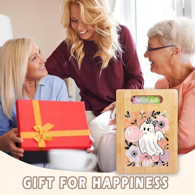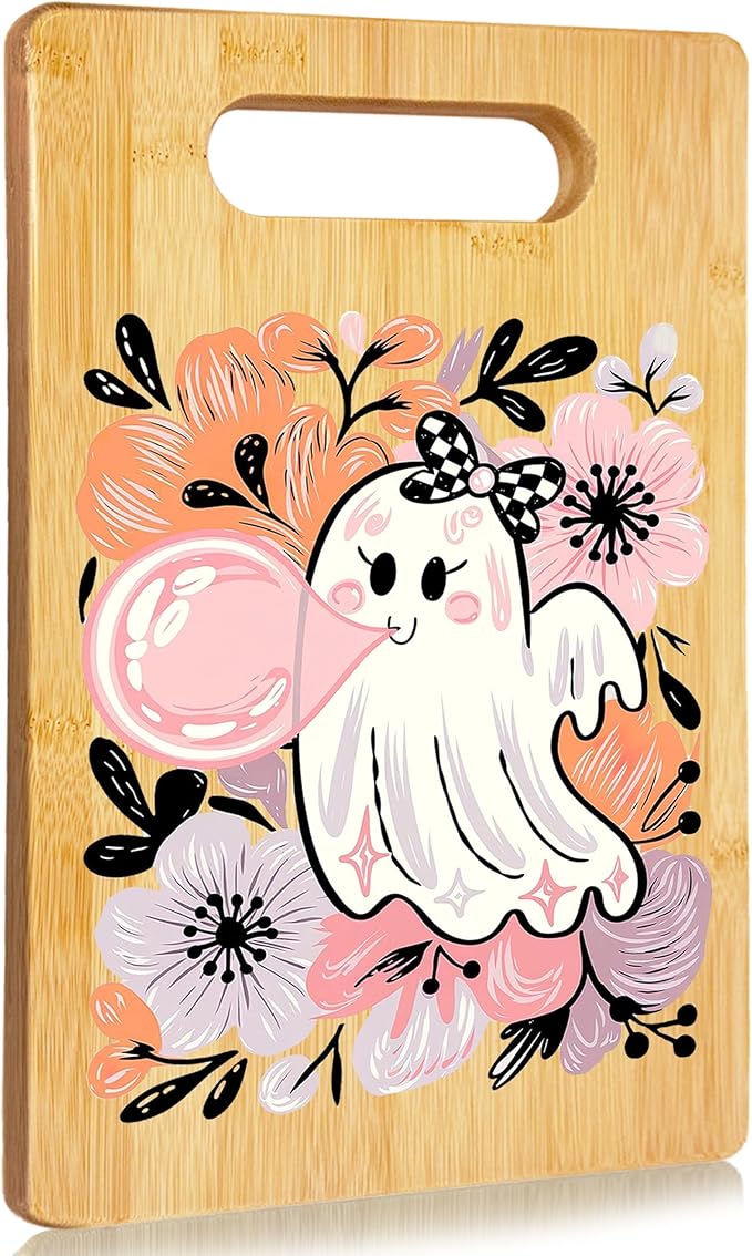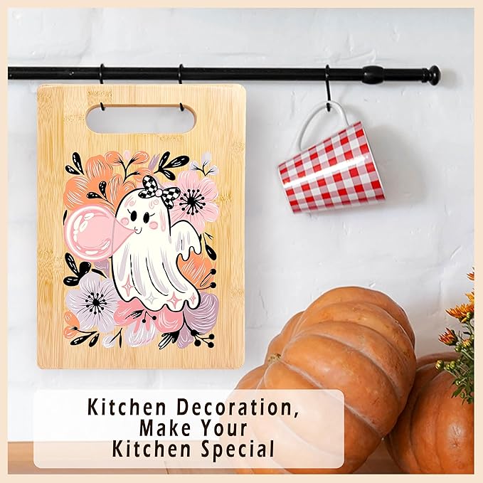 SPBL&L Halloween Floral Pink Ghost Cutting Board, Halloween Gifts for Women, Ghost Kitchen Decor, Coquette Spooky Season Decorative Bamboo Cutting Chopping Board for Kitchen