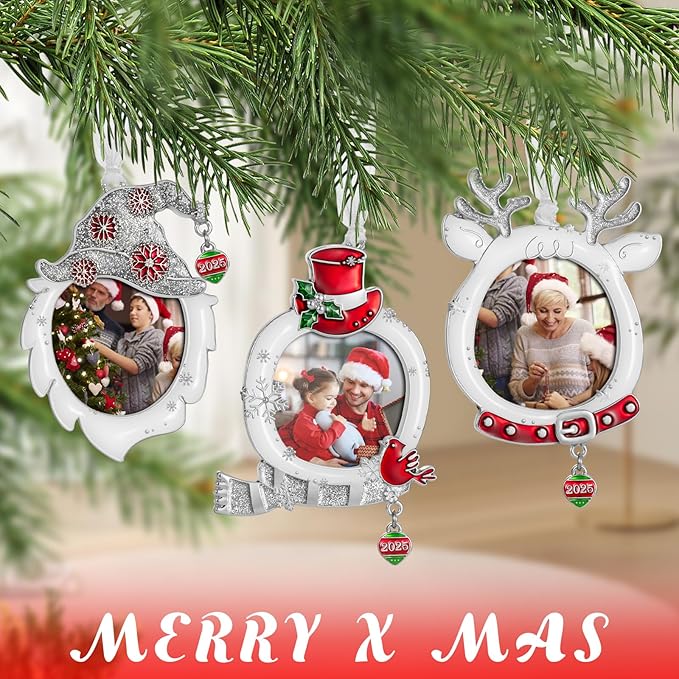 West style 2025 Snowflake Christmas Tree Ornaments Set 3 Pieces-Metallic Picture Frame Ornament Hanging Home Deco Gnomes Reindeer Hanging Pendant Holiday Keepsake Gift (White)