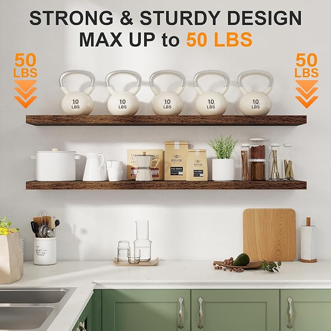 - 【FARMHOUSE RUSTIC WALL SHELF】These floating shelves are made of premium engineered wood board and invisible one-piece bracket. The rustic wooden grain surface add character and warmth to any modern or traditional interior with these thick floating shelves, contrast shelves at staggering heights on the wall or mount side-by-side or in the corner for a clean streamlined look.