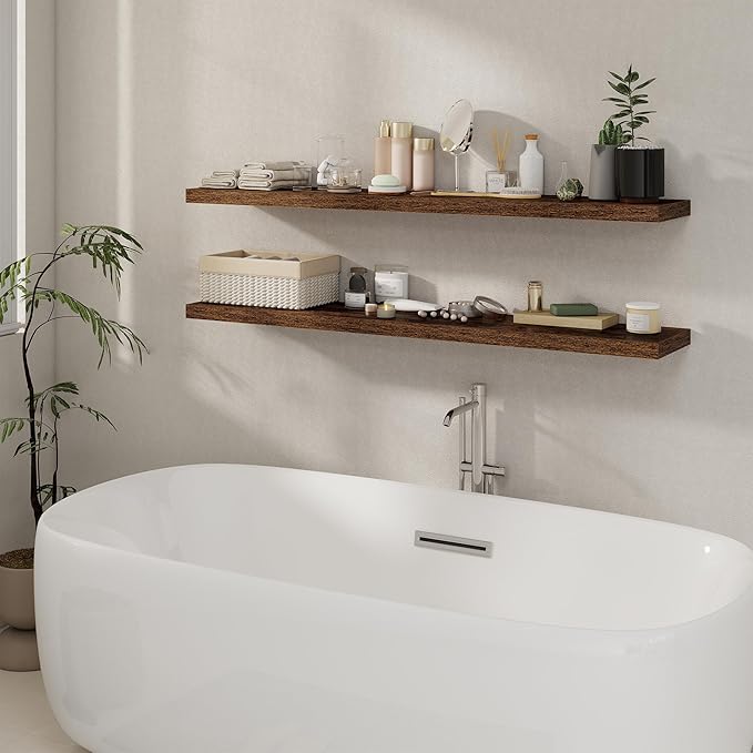 Fun Memories 55 Inch Floating Shelves for Wall 2 Pack Shelves for Bedroom|Kitchen|Bathroom Wall Mounted Rustic Wood Floating Shelf with Invisible Brackets for Books|Storage|Decor, Rustic Brown