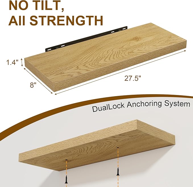 Floating Shelves for Wall, 27.5 Inch Bathroom Shelves Set of 2, Rustic Wood Wall Shelf with Invisible Brackets for Books|Storage|Decor, 8 Inch Deep Floating Shelf for Bedroom|Kitchen, Oak