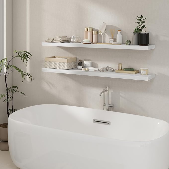Fun Memories 55 Inch Floating Shelves for Wall 2 Pack Shelves for Bedroom|Kitchen|Bathroom Wall Mounted Rustic Wood Floating Shelf with Invisible Brackets for Books|Storage|Decor, White