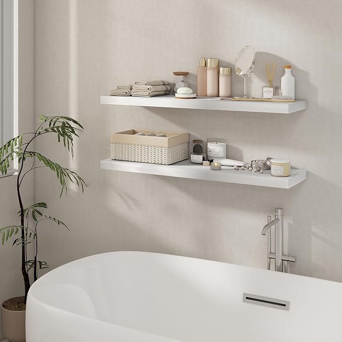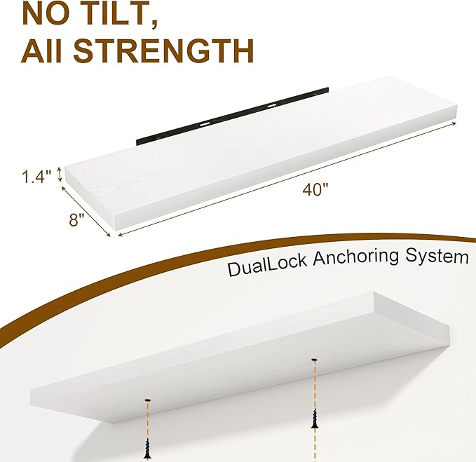 Fun Memories 40 Inch Floating Shelves Set of 2, 8 Inch Deep Wall Shelf, Rustic Wood Storage Shelves for Bedroom, Kitchen, Bathroom, Wall-Mounted Shelf with Invisible Brackets for Books|Storage, White