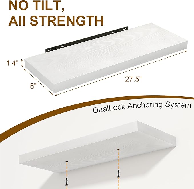 White Floating Shelves for Wall, 27.5 Inch Bathroom Shelves Set of 2, Rustic Wood Wall Shelf with Invisible Brackets for Books|Storage|Decor, 8 Inch Deep Floating Shelf for Bedroom|Kitchen