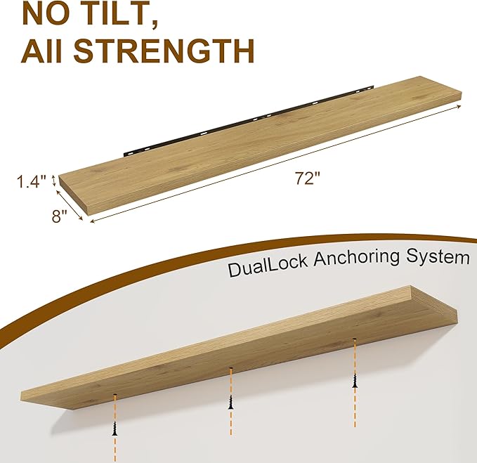 Fun Memories 72 Inch Floating Shelves for Wall, 8 Inch Deep Floating Shelf, Large Shelves with Invisible Bracket for Books|Storage, Rustic Wood Wall Shelf for Bedroom, Kitchen, Living Room, Oak