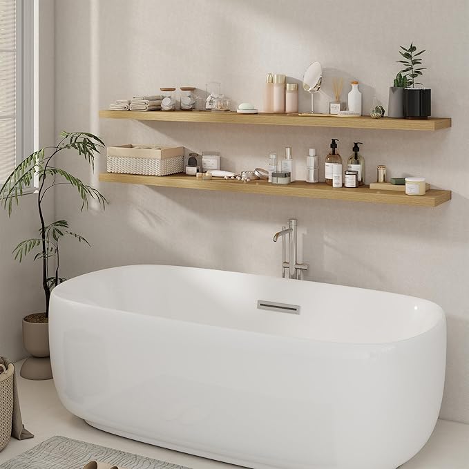 - 【DECORATIVE & FUNCTIONAL】The wall-mounted floating shelves are designed for decoration and storage, utilizing and decorating any space in your home. Used as shelf decor to show your collection, books, or prize, the hanging shelves are perfect for displaying your photo frame, small plants, model, or audio in your living room, office, study. And can also use as over the toilet storage shelf in the bathroom to hold toiletries or used as kitchen shelf to storage condiments.