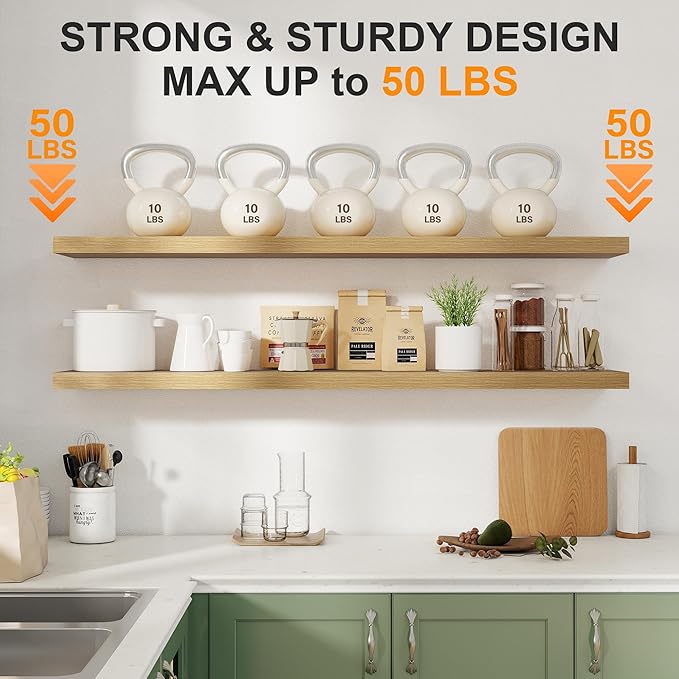 - 【FARMHOUSE RUSTIC WALL SHELF】These floating shelves are made of premium engineered wood board and invisible one-piece bracket. The rustic wooden grain surface add character and warmth to any modern or traditional interior with these thick floating shelves, contrast shelves at staggering heights on the wall or mount side-by-side or in the corner for a clean streamlined look.