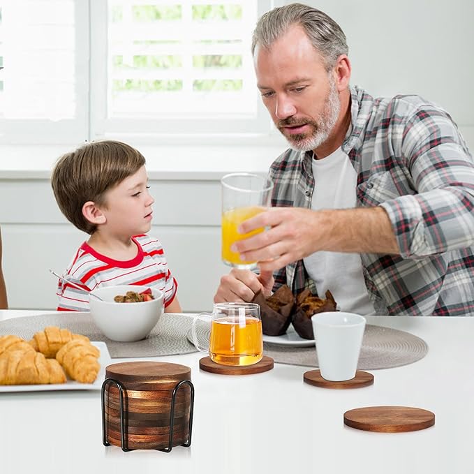 - Wood Coasters Set for Drinks: The absorbent coaster set consists of 10 wooded coasters and 1 metal holder. Wood coaster have the water absorption effect and better to protect your furniture. Holder is convenient to store other coasters not in use. Using these coasters for drinks will make your experience even more comfortable