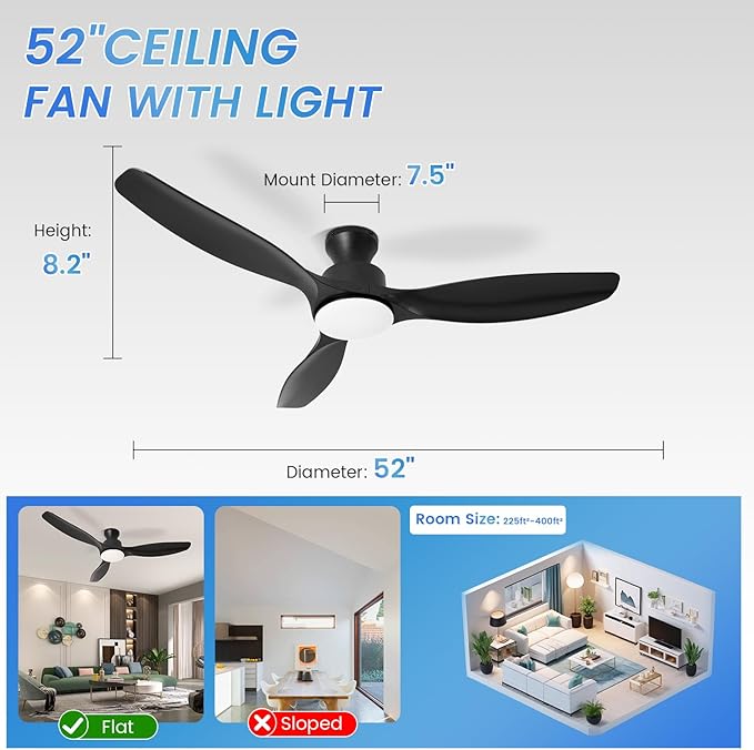 - 52 inch Elegant and Versatile Design: This black Flush Mount Ceiling Fan with Light is an outstanding choice that combines style, functionality, and energy efficiency to enhance your living spaces. This 52 inch black ceiling fan with light, is ideal for rooms ranging from 225 to 400 square feet and perfect for various spaces like patios, indoors, and outdoors. It can add a touch of style and functionality to your farmhouse, bedroom, or outdoor living area.