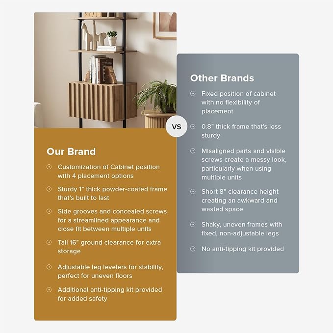 - Flexibility: With two storage areas which conceals adjustable shelves with 3 set heights, and two open niches, it gives you the flexibility of customizing your storage needs however you like it, with a perfect amount of space