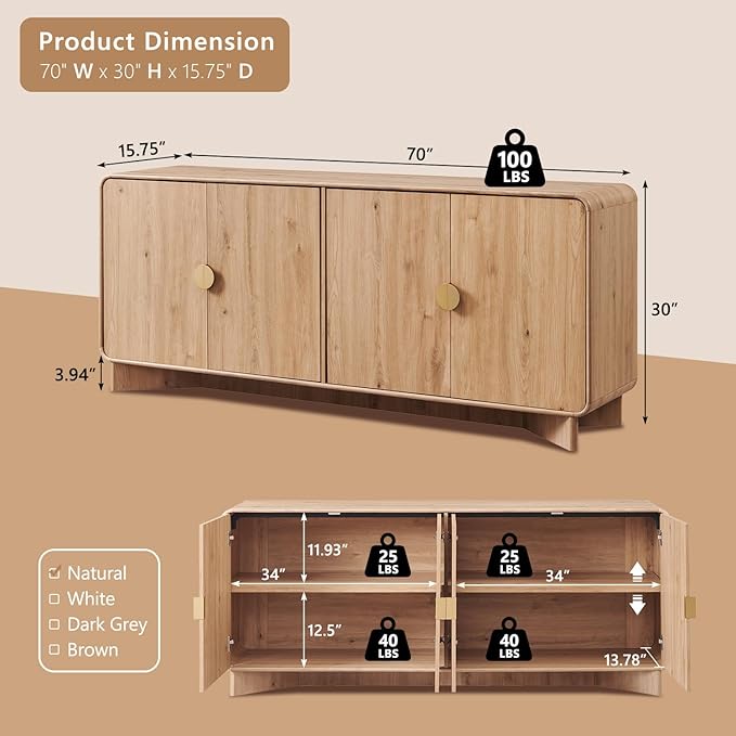 - Dimensions & Storage: 70"W x 15.75"D x 30"H wooden buffet cabinet blending modern aesthetics with function. Features 2 adjustable cabinets (interior: 34"W x 13.78"D x 24.43"H) offering generous storage with easy access. Ideal as a kitchen storage unit, dining sideboard, or living room organizer—perfect for pantry items, dishes, and appliances