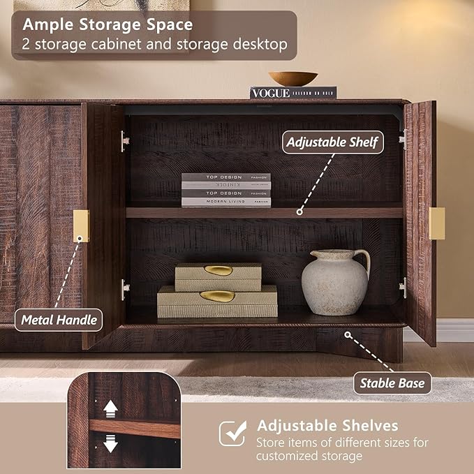 - Adjustable Shelves: The kitchen buffet storage cabinet features 2 height adjustable shelves, allowing you to freely customize the spacing between shelves according to the size of your stored items. Define your storage layout with complete freedom.This flexibility ensures your storage space remains highly efficient at all times. And 4 door cabinets provide convenient access while keeping everything neatly organized and clutter-free