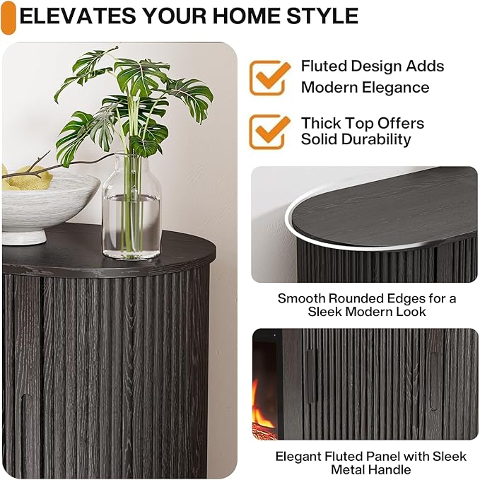 - Sliding Doors and Oval Design: Combining smooth-gliding doors with rounded corners, this storage electric fireplace TV stand blends soft elegance with practical aesthetics. The oval silhouette softens the space while neatly housing audiovisual equipment and accessories. The fireplace walnut TV stand's wood-grain finish offers both premium texture and water-resistant properties, engineered for lasting durability.