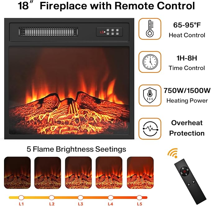 - Comfort & Safety & Energy Saving Electric Fireplace: Combine a 58" TV stand with 23" electric fireplace. 5 adjustable flame brightness & speed create a warm atmosphere. Meanwhile, the fireplace walnut TV stand has overheat protection that ensures your safety. Two heating settings 750W/1500W, this fireplace TV stand requires less energy, and features a 1-8 hour timer for auto-shutoff.