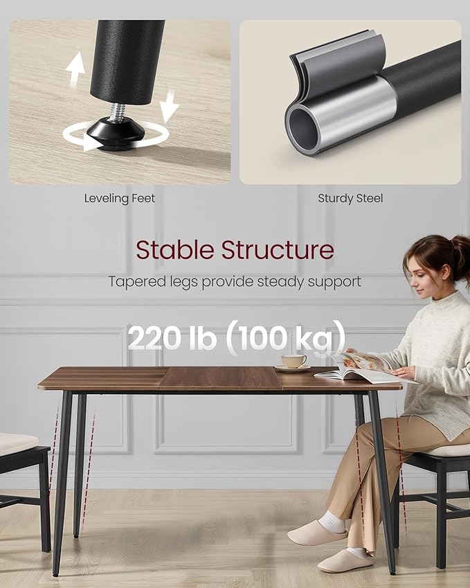 - Stable and Sturdy Support: Splayed steel legs and swivel leveling feet keep this rectangle dining table stable on slightly uneven floors and support up to 220 lb, offering reliable support for daily meals