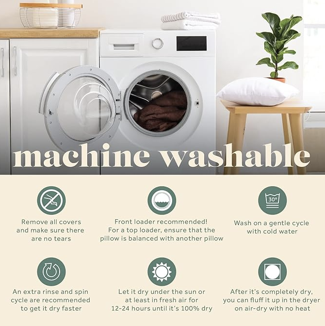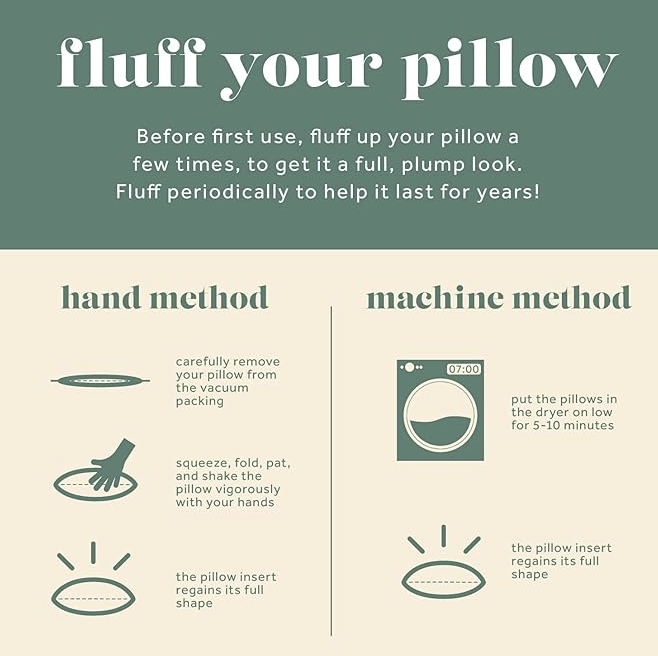 𝐔𝐒𝐀𝐆𝐄 𝐀𝐍𝐃 𝐂𝐀𝐑𝐄: For indoor use, with all types of shams & covers, before first use, and as needed, fluff up your pillow a few times, to get it a full plump look, this will help it last for years!